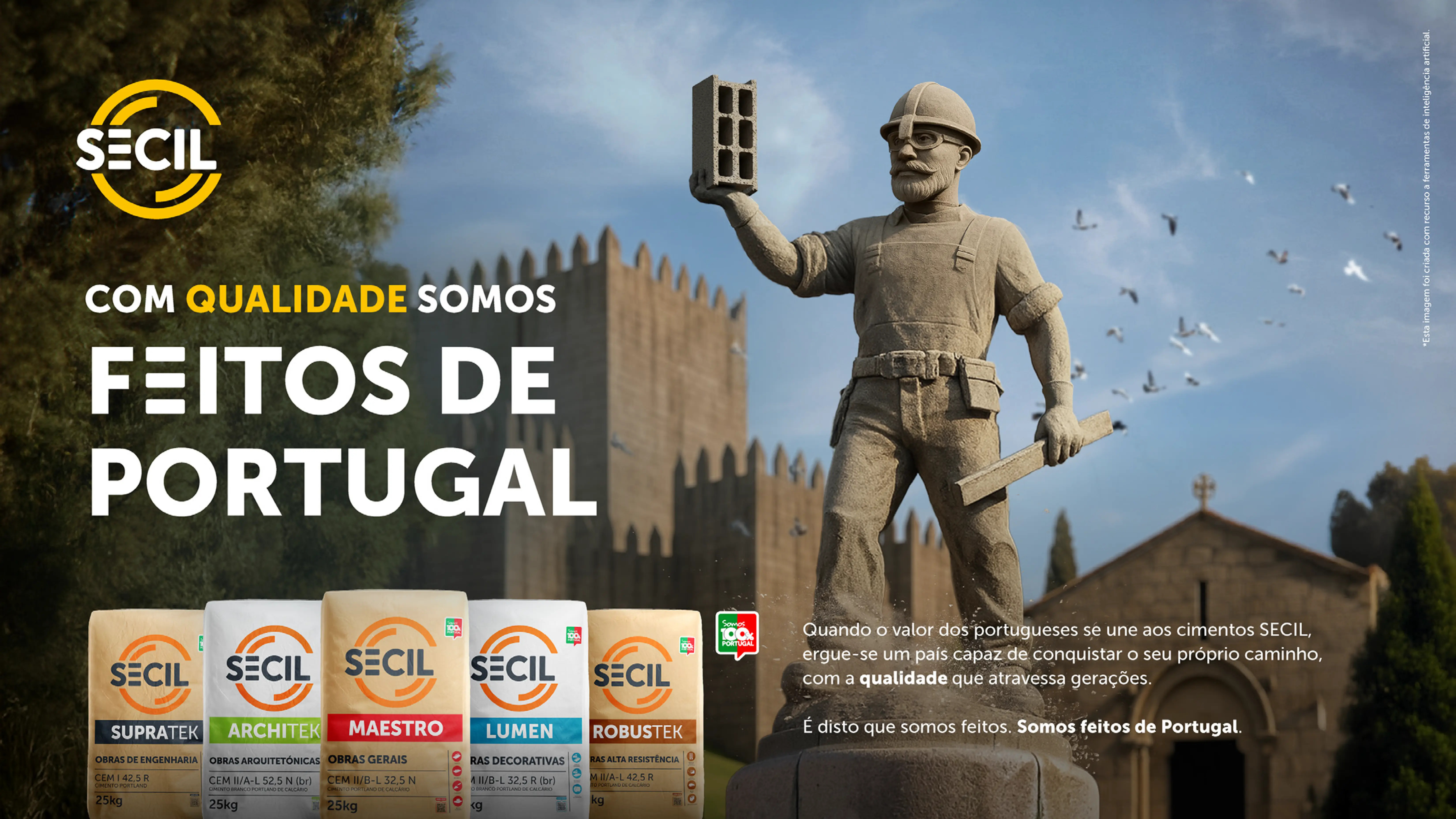 Sob o mote “Feitos de Portugal”, a Secil celebra a qualidade, confiança e inovação enquanto enaltece o papel ativo de todos os que constroem Portugal, do passado ao futuro, criando paralelismos com os seus produtos, pensados para servir todas as exigências e contribuir para projetos sólidos e duradouros.