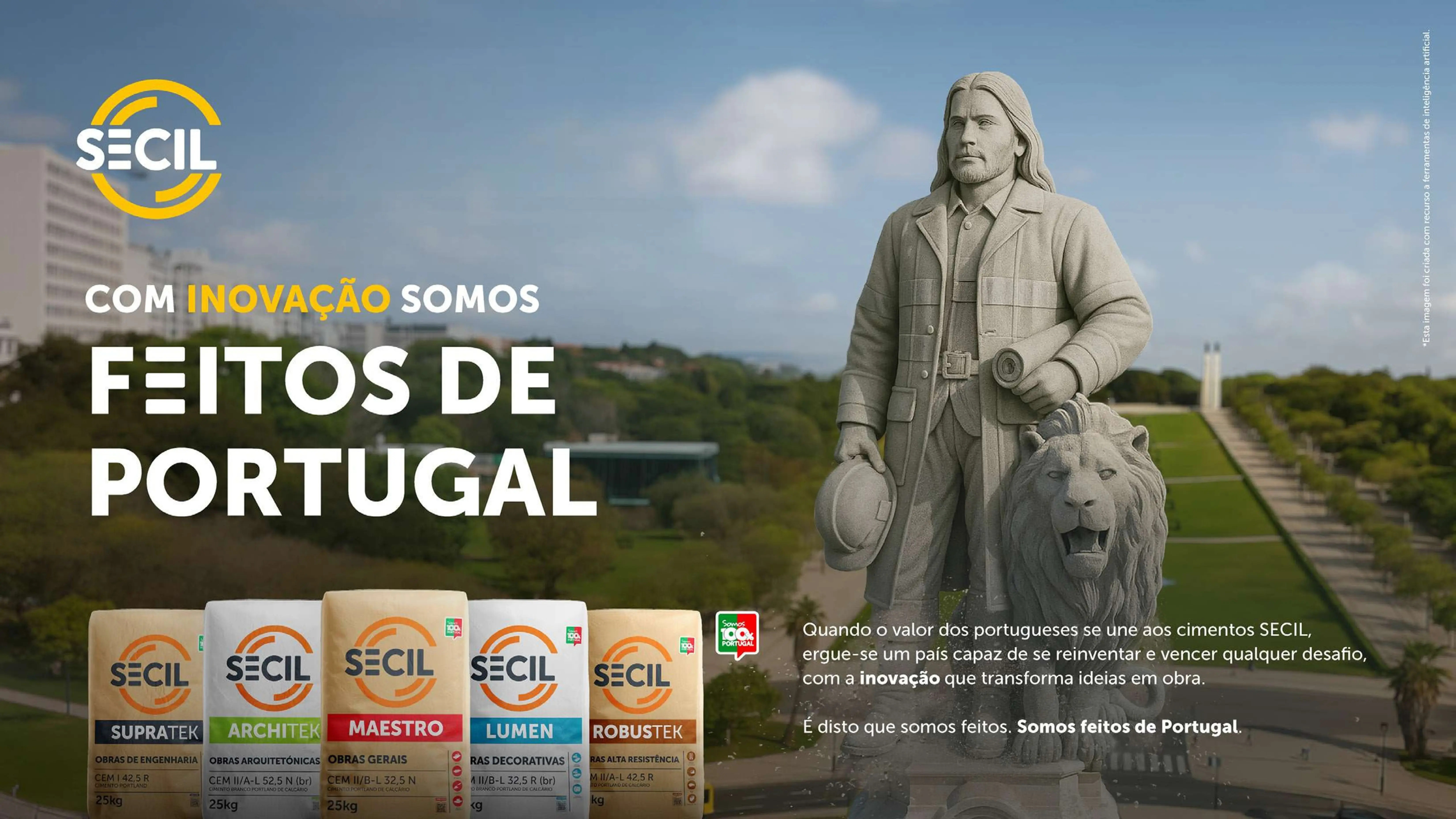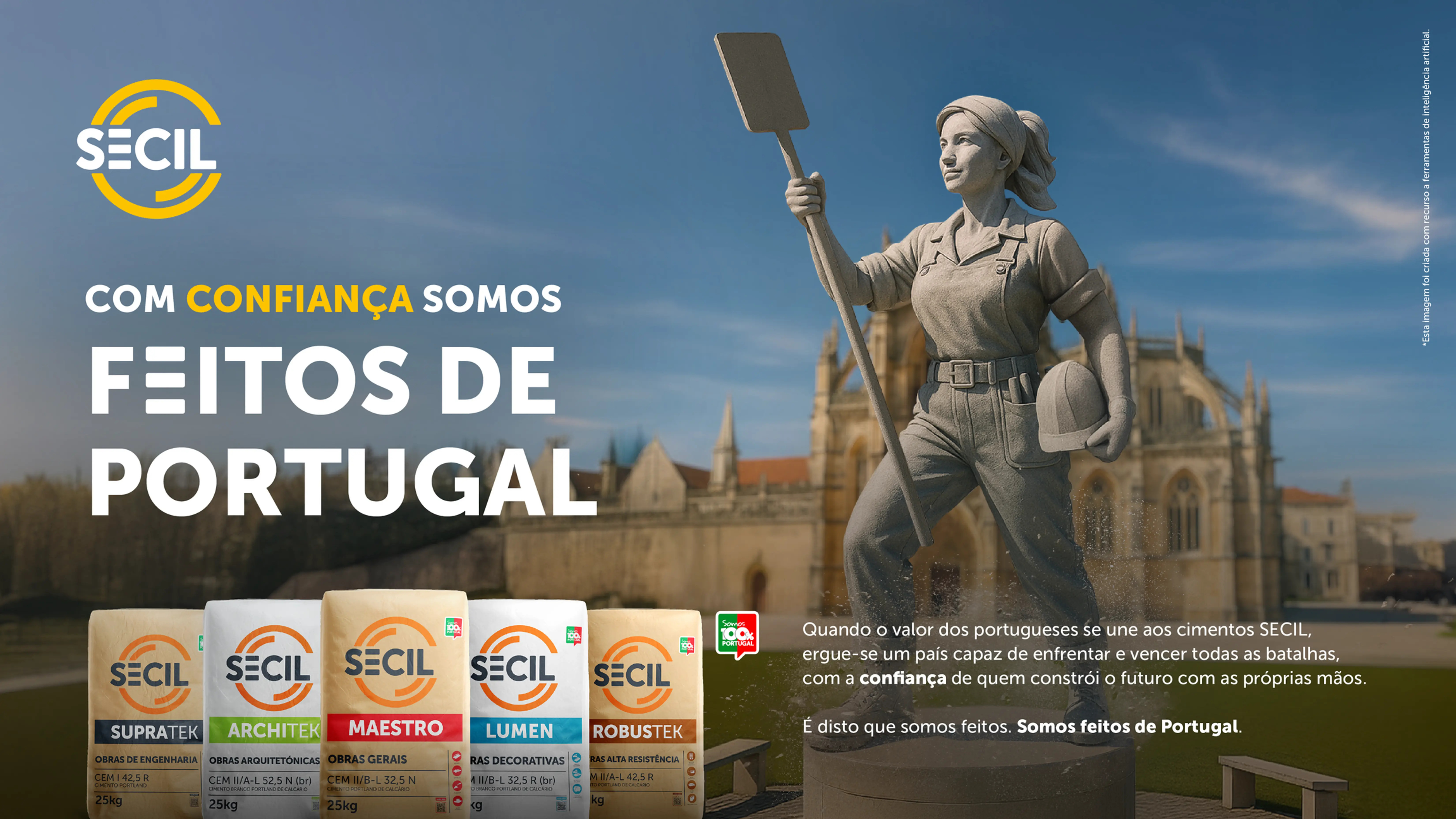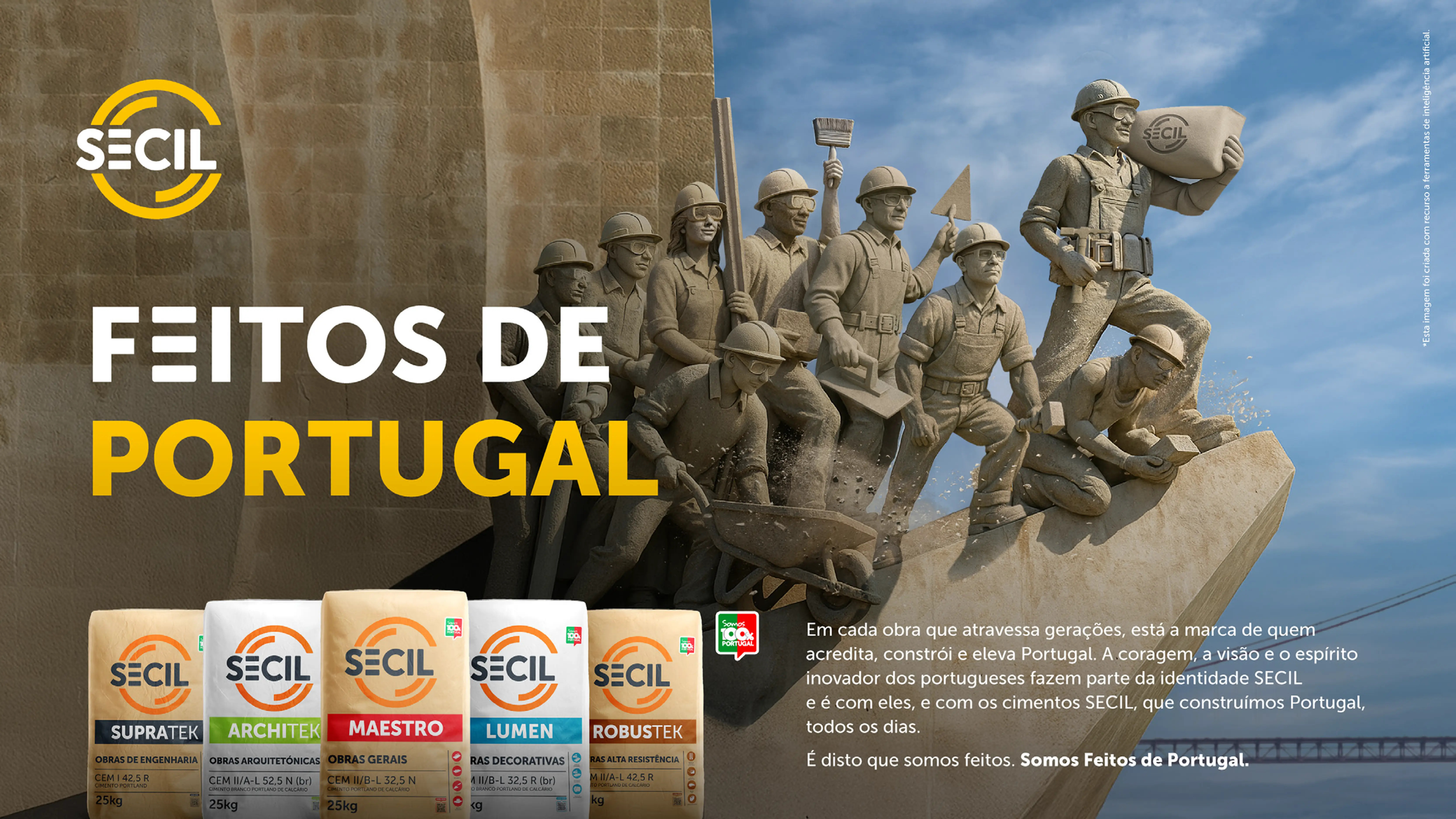 Inspirada na portugalidade e nos feitos históricos que unem gerações, a campanha centra-se na relação duradoura entre os cimentos Secil, os portugueses e a inovação nacional, exibindo uma abordagem visual que integra orgulho, tradição e referência a monumentos e figuras icónicas da história coletiva do país.