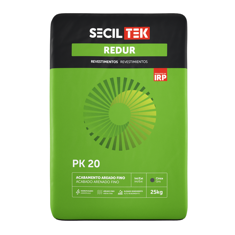 O REDUR PK 20é formulado a partir de ligantes mistos, agregados siliciosos, hidrófugos e adições.